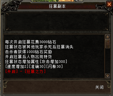 开启狂暴需要3000钻石,开启后增加属性,前期打怪,后期打架用途非常大,开启后被人物击杀狂暴将掉落消失,被怪物击杀不掉,杀死狂暴玩家可额外获取1000钻石。